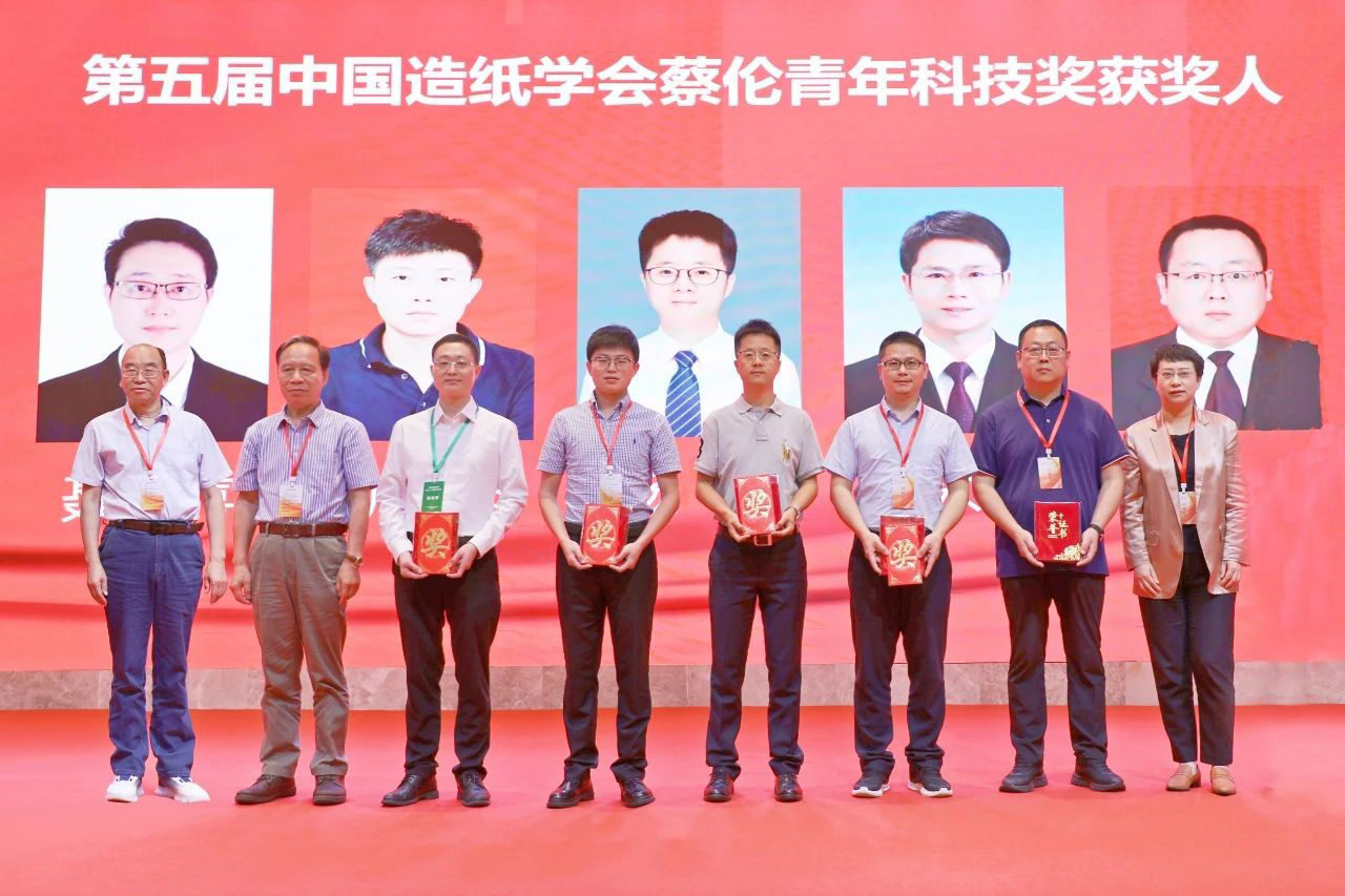 Professor Nie Shuangxi (third from the left) awarded the Cai Lun Youth Science and Technology Award by the China Technical Association of Paper Industry