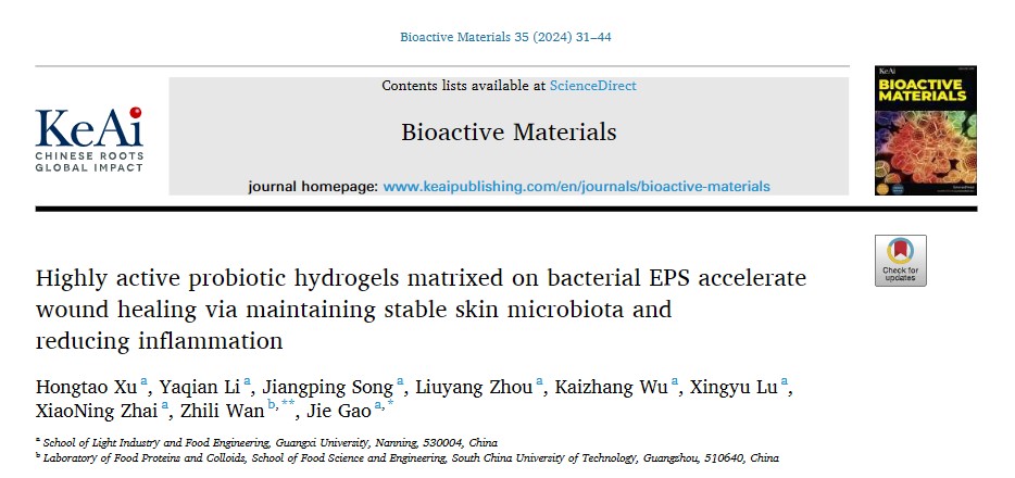 高洁副教授课题组在国际知名期刊《Bioactive Materials》(《生物活性材料》)上发表论文Highly active probiotic hydrogels matrixed on bacterial EPS accelerate wound healing via maintaining stable skin microbiota and reducing inflammation。《Bioactive Materials》是KeAi Publishing出版的刊物,是材料与化学学科的国际著名期刊,期刊主题包含纳米技术,化学工程,生物医学工程等众多子学科,最新影响因子为18.9。