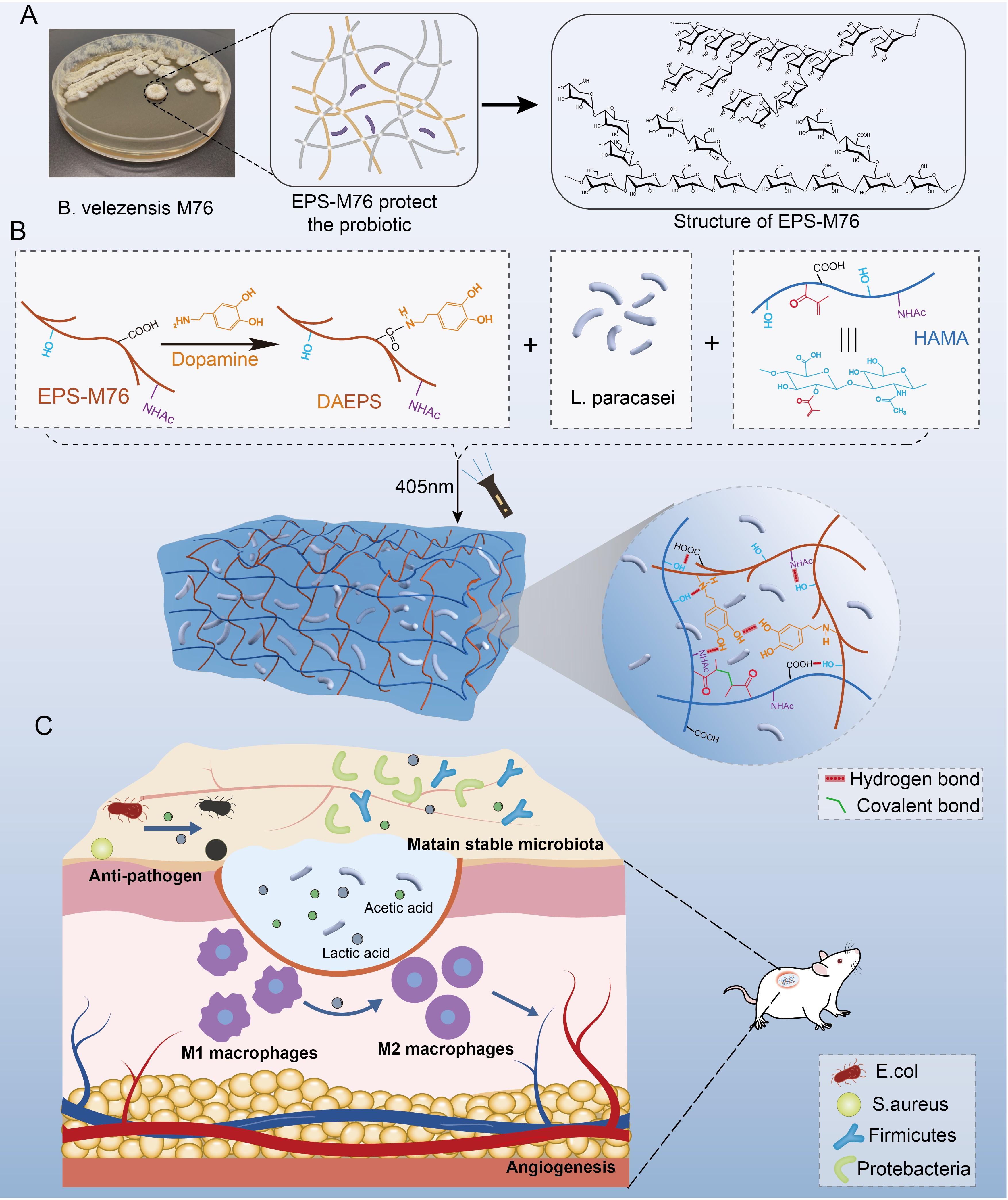 皮肤微生物群在伤口愈合中发挥着重要作用,传统的抗菌水凝胶在杀死致病菌的同时不可避免的抑制皮肤益生菌的生长,从而破坏皮肤菌群的平衡。研究团队基于细菌胞外多糖(EPS),设计了一种既能抵御致病菌又能保持皮肤菌群稳定的活益生菌水凝胶。包埋在水凝胶中的副干酪乳杆菌(Lactobacillus paracasei TYM202)具有促进伤口愈合的活性,而水凝胶基质 EPS-M76具有益生元活性,可促进副干酪乳杆菌的增殖和新陈代谢。此外,该水凝胶可降低伤口愈合过程中的炎症发生率,同时促进血管生成,增加胶原蛋白沉积。该论文得到华南理工大学食品科学与工程学院万芝力教授的大力支持。麻豆a片