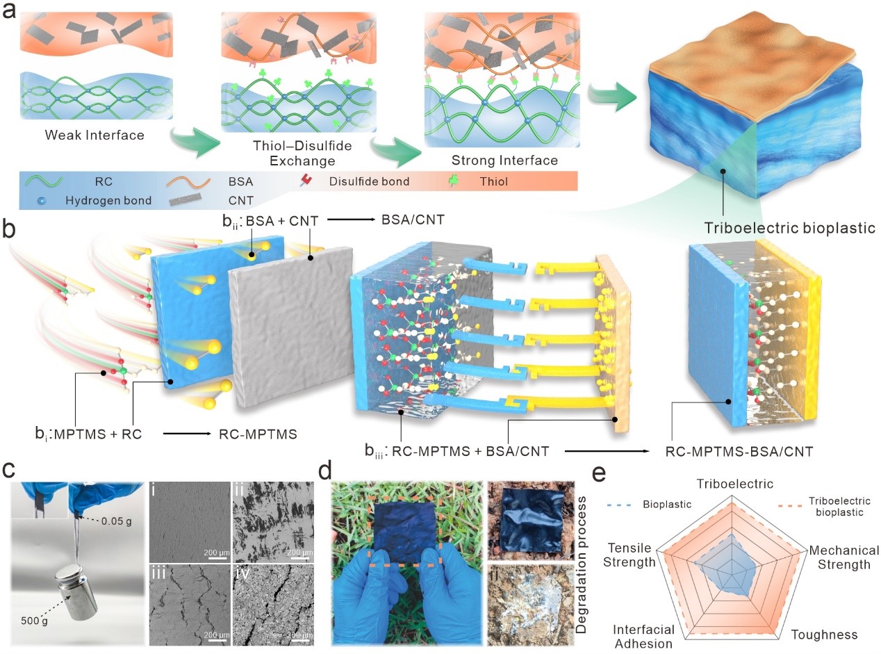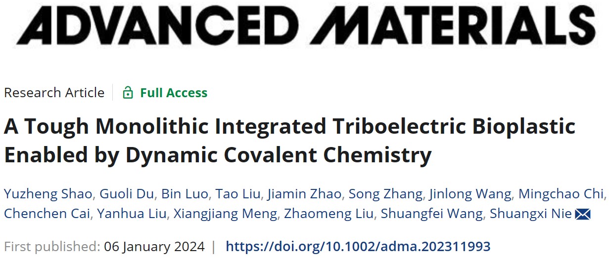 王双飞院士团队“先进木质纤维材料”课题组基于纤维素优异的可降解性和摩擦电特性,通过动态共价化学方法构建了一种坚固的摩擦电生物塑料,解决了绿色电子产品中聚合物基材与导电涂层界面易剥离破碎的难题。该研究成果以“A Tough Monolithic Integrated Triboelectric Bioplastic Enabled by Dynamic Covalent Chemistry”为题发表于材料领域国际顶级期刊《Advanced Materials》上,麻豆a片