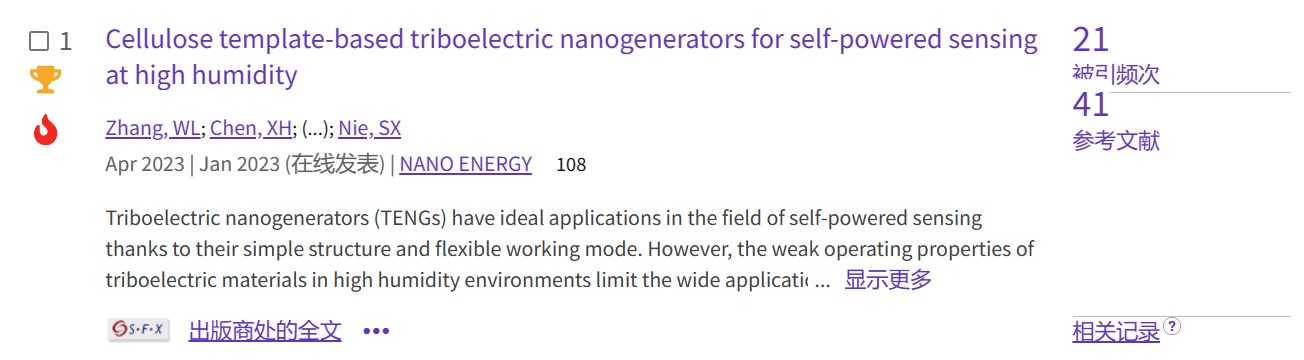 【热点论文2】轻工技术与工程专业2020级硕士研究生张旺林等人以天然纤维素为模板制备了亲水性摩擦电材料,为高湿环境下实时自供电传感提供可持续输出。模板化过程中纤维素与湿敏材料的协同作用提高了材料的亲水性。该摩擦电材料具有高灵敏度(0.8/1%)和高稳定性(150 s)的良好性能,能够在高湿环境下进行可视化湿度传感。相关研究成果于2023年1月10日以题为“Cellulose template-based triboelectric nanogenerators for self-powered sensing at high humidity”在线发表于《Nano Energy》。论文链接://www.sciencedirect.com/science/article/pii/S2211285523000320