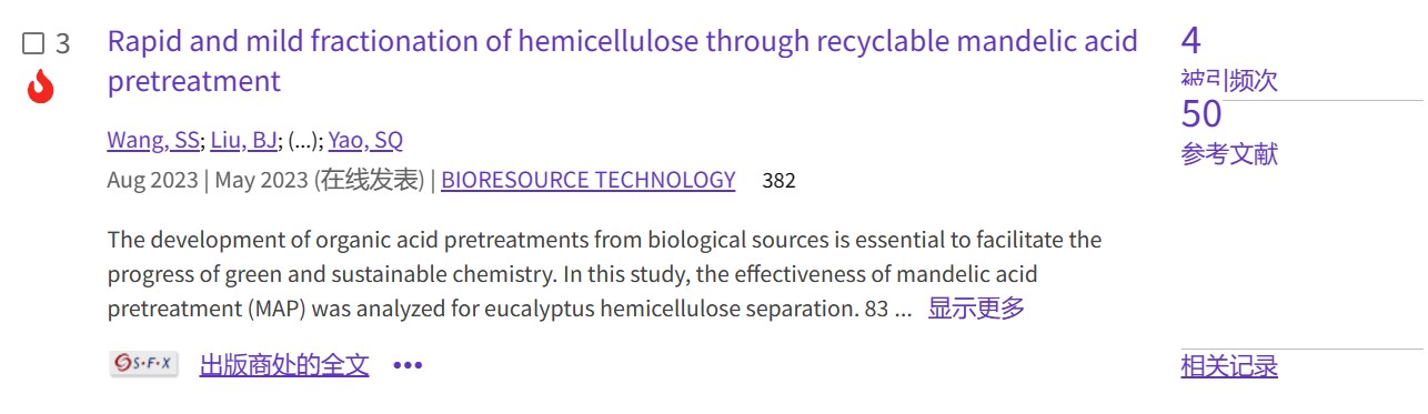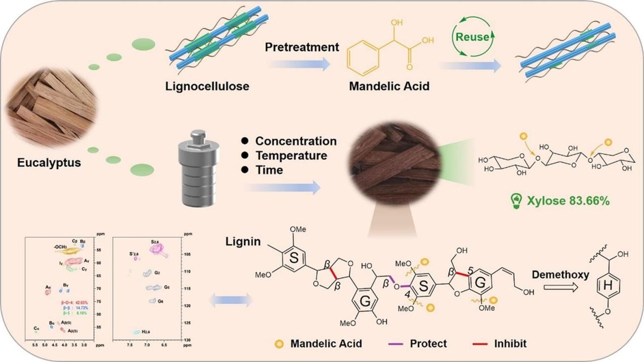 【热点论文5】材料与化工专业2021级硕士研究生王珊珊等人开发了扁桃酸预处理技术,实现了对桉木半纤维素的高效分离。扁桃酸水解液经过6次重复使用后,其分离效率仍稳定有效。样品具有较高的热稳定性、较高的结晶度和优异的表面元素分布。从不同木质素的结构可以看出,扁桃酸有效地抑制了木质素的缩聚。特别是发现了扁桃酸对木质素的去甲氧基化作用。为构建高效分离半纤维素的新型有机酸预处理开辟了一条新途径。相关研究成果于2023年5月10日以题为“Rapid and mild fractionation of hemicellulose through recyclable mandelic acid pretreatment ”在线发表于《Bioresource Technology》。论文链接://www.sciencedirect.com/science/article/pii/S0960852423005801