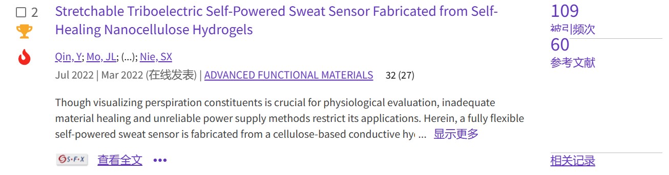 【热点论文1】制糖工程专业2018级博士生秦影等人开发了一种可快速自愈合的纤维素基导电水凝胶电极,用于全柔性的自供电汗液传感器。通过选择性的捕捉汗液中的特定离子(钾、钙和钠离子),使其参与并调控运动能转化为电能的过程,实现了对人体状态的可视化实时监测。相关研究成果于2022年3月31日以题为“Stretchable Triboelectric Self-Powered Sweat Sensor Fabricated From Self-Healing Nanocellulose Hydrogels”在线发表于《Advanced Functional Materials》。值得一提的是,该论文已是第二次入选ESI热点论文,其影响力可见一斑。论文链接://onlinelibrary.wiley.com/doi/full/10.1002/adfm.202201846