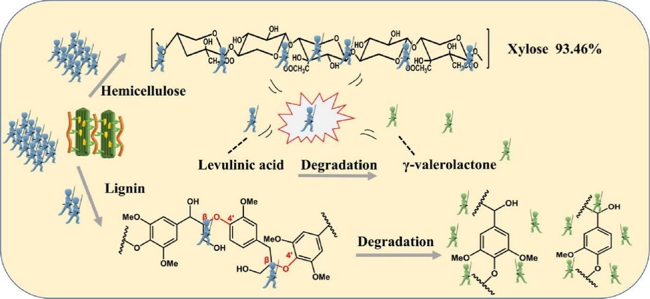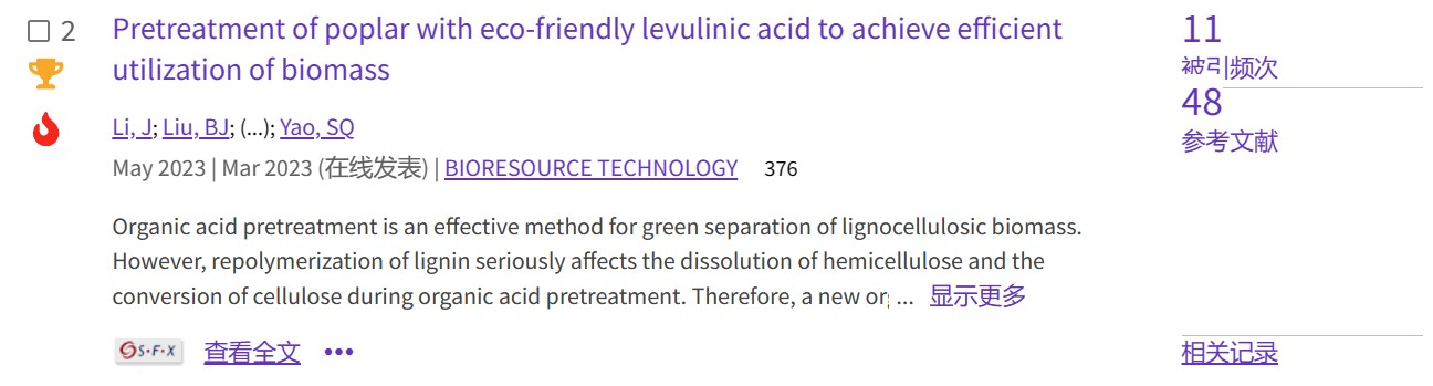 【热点论文4】材料与化工专业2021级硕士研究生李娇等人开发了一种新的有机酸预处理—乙酰丙酸预处理,在不添加其他添加剂的情况下对木质纤维素生物质进行解构,成功实现了半纤维素的高效优先分离。并且在半纤维素的高效优先分离过程中,由于γ-戊内酯的溶解作用,木质素的再聚合被有效抑制。研究结果为建立绿色高效有机酸预处理和有效抑制木质素再聚合提供了理论支持。相关研究成果于2023年2月5日以题为“Pretreatment of poplar with eco-friendly levulinic acid to achieve efficient utilization of biomass”在线发表于《Bioresource Technology》。论文链接://www.sciencedirect.com/science/article/pii/S096085242300281X