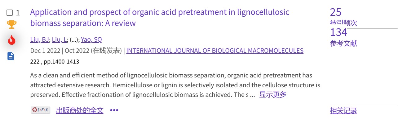 【热点论文3】轻工技术与工程专业2020级博士研究生刘宝杰等人综述了不同有机酸对半纤维素和木质素的分离特性。根据分离机理,将半纤维素有机酸分离为氢离子酸、自催化酸和α-羟基酸。木质素的分离取决于有机酸的溶解机理和空间效应。此外,还分析了有机酸预处理面临的挑战和前景,对未来有机酸预处理技术的发展提供了指导意见。相关研究成果于2022年10月1日以题为“Application and prospect of organic acid pretreatment in lignocellulosic biomass separation: A review”在线发表于《International Journal of Biological Macromolecules》。论文链接://www.sciencedirect.com/science/article/pii/S0141813022022103