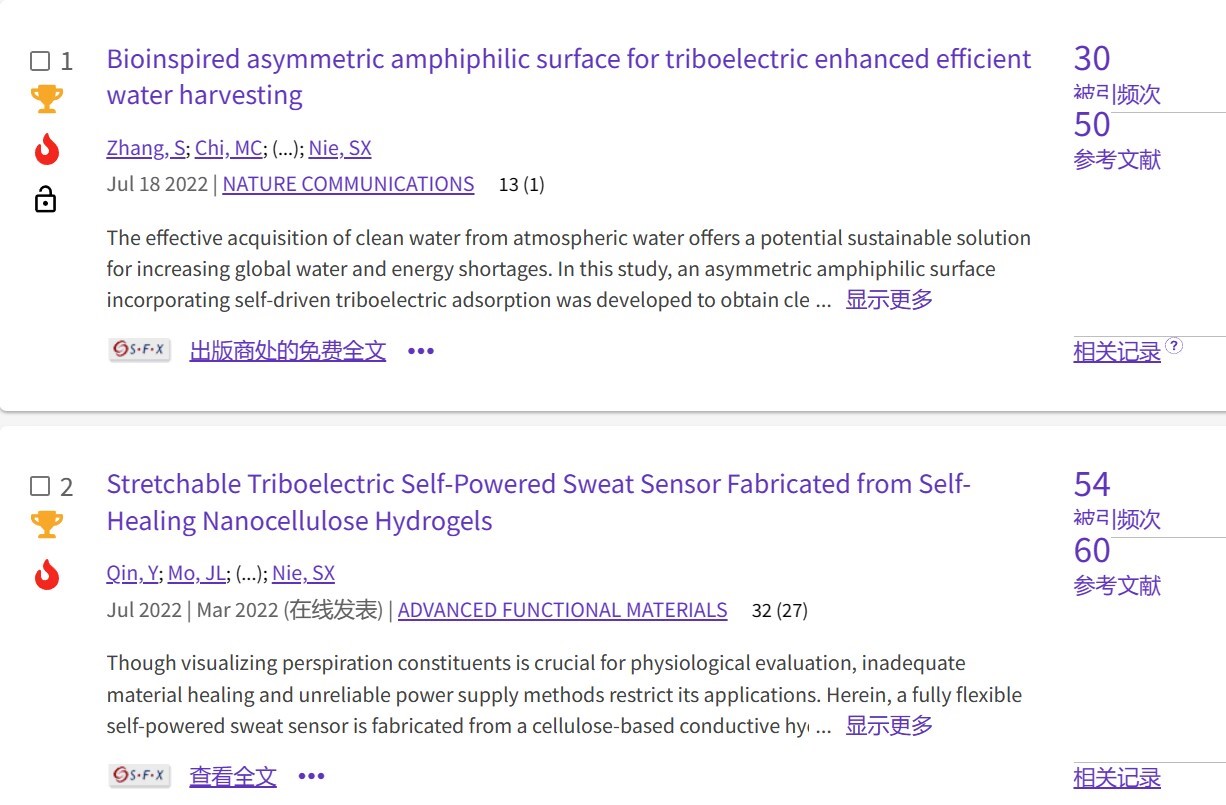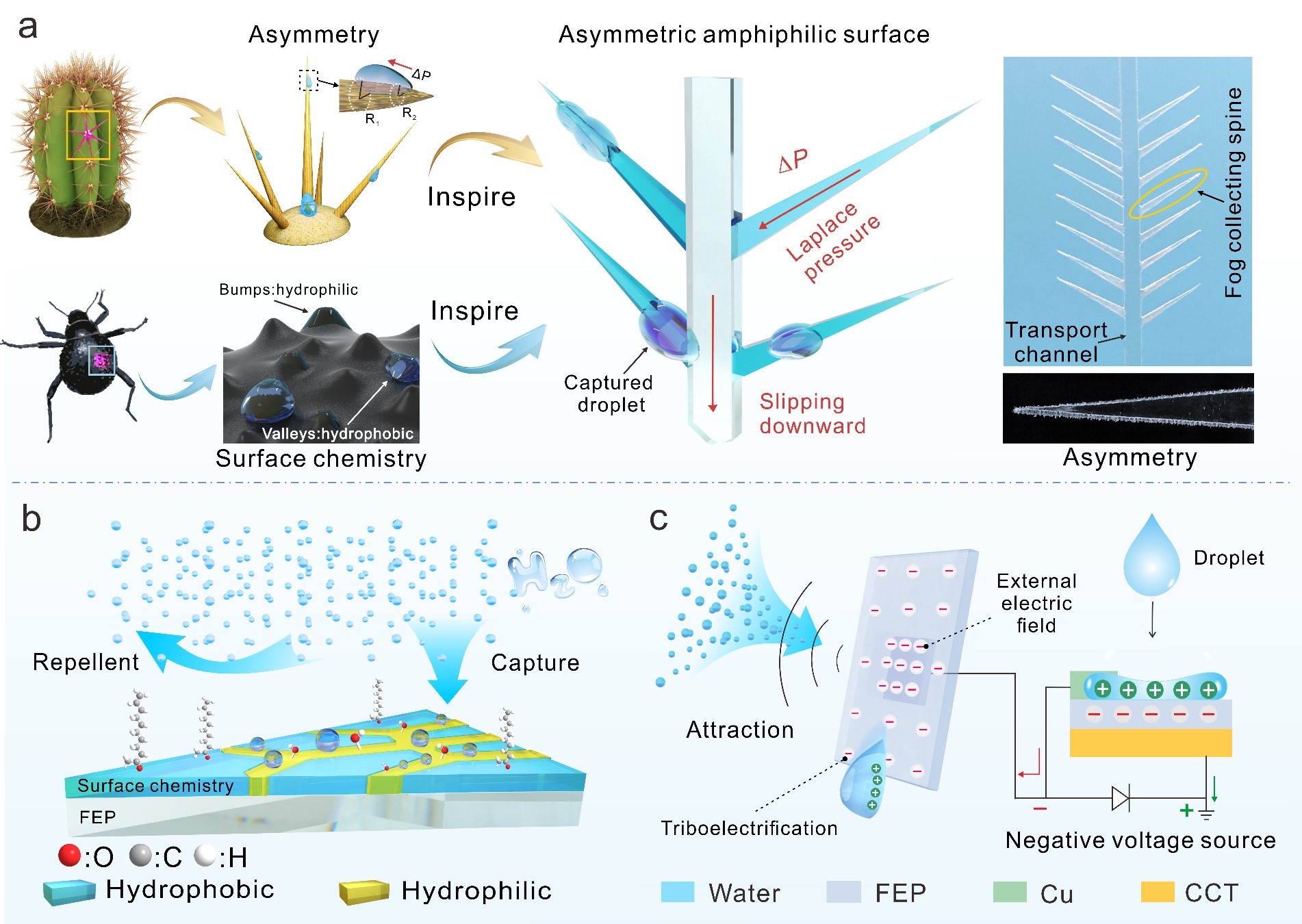 轻工技术与工程专业2021级博士生张松等人从仙人掌刺和甲虫翅翘结构获得灵感,构造了双重仿生结构以实现液滴快速凝结和去除。首次揭示了水收集表面与液滴之间的界面电荷相互作用,并将其应用于大气水收集,实现了前所未有的极高水收集效率。相关研究成果于2022年7月18日以题为“Bioinspired asymmetric amphiphilic surface for triboelectric enhanced efficient water harvesting”在线发表于《Nature Communications》。论文链接//doi-org-s.vpn.apianmadou.com:8118/10.1038/s41467-022-31987-w