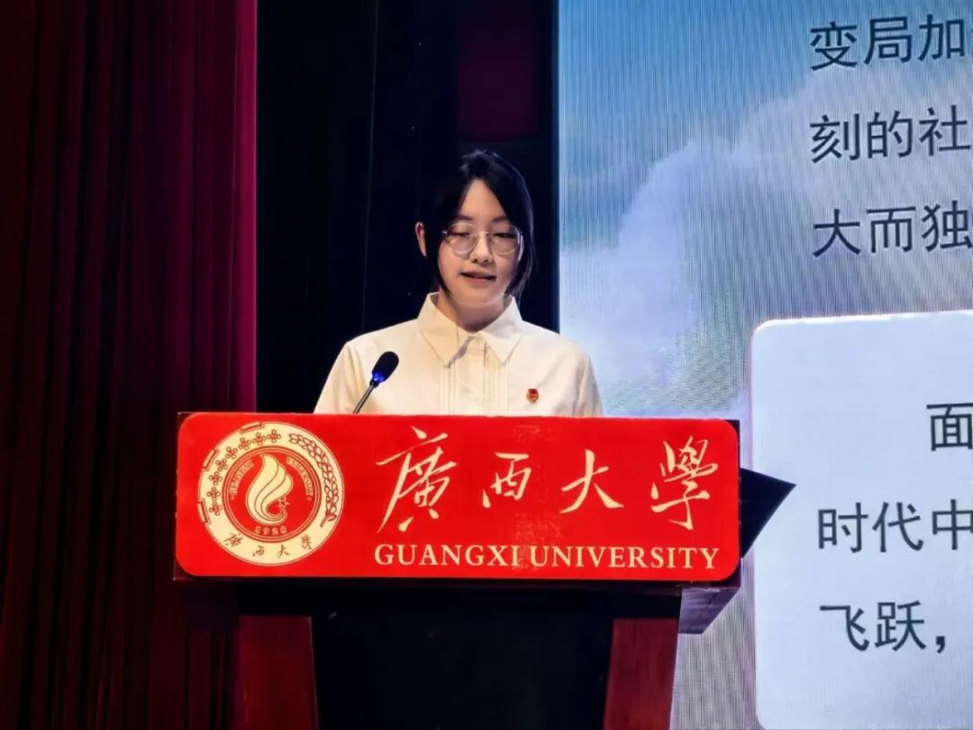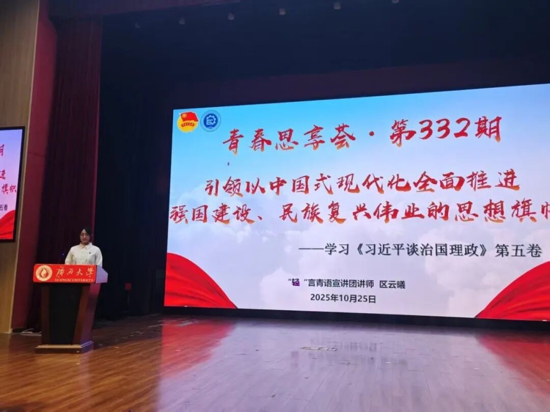 在大学生活动中心小剧场举办第332期“青春思享荟”,专题学习《习近平谈治国理政》第五卷。本次活动邀请了学院“轻”言青语宣讲团讲师区云曦担任主讲人。学院团委全体团干、研究生会与学生会组织部成员等180余名青年代表参加,共同深入学习党的创新理论,凝聚思想共识。活动由学院团委副书记张琬婷同学主持。