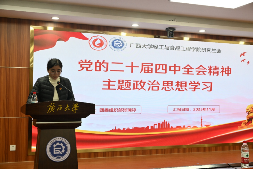 张琬婷围绕全会审议通过的党中央“十五五”规划《建议》,聚焦高质量发展、科技自立自强、现代化产业体系建设等核心议题,系统阐释了未来五年发展的指导方针、主要目标与战略任务。同时,结合轻工与食品工程领域特色,解读了党中央“十五五”规划《建议》中关于巩固实体经济、培育新兴产业等内容。现场研究生积极互动,就如何将全会精神融入科研创新展开讨论。