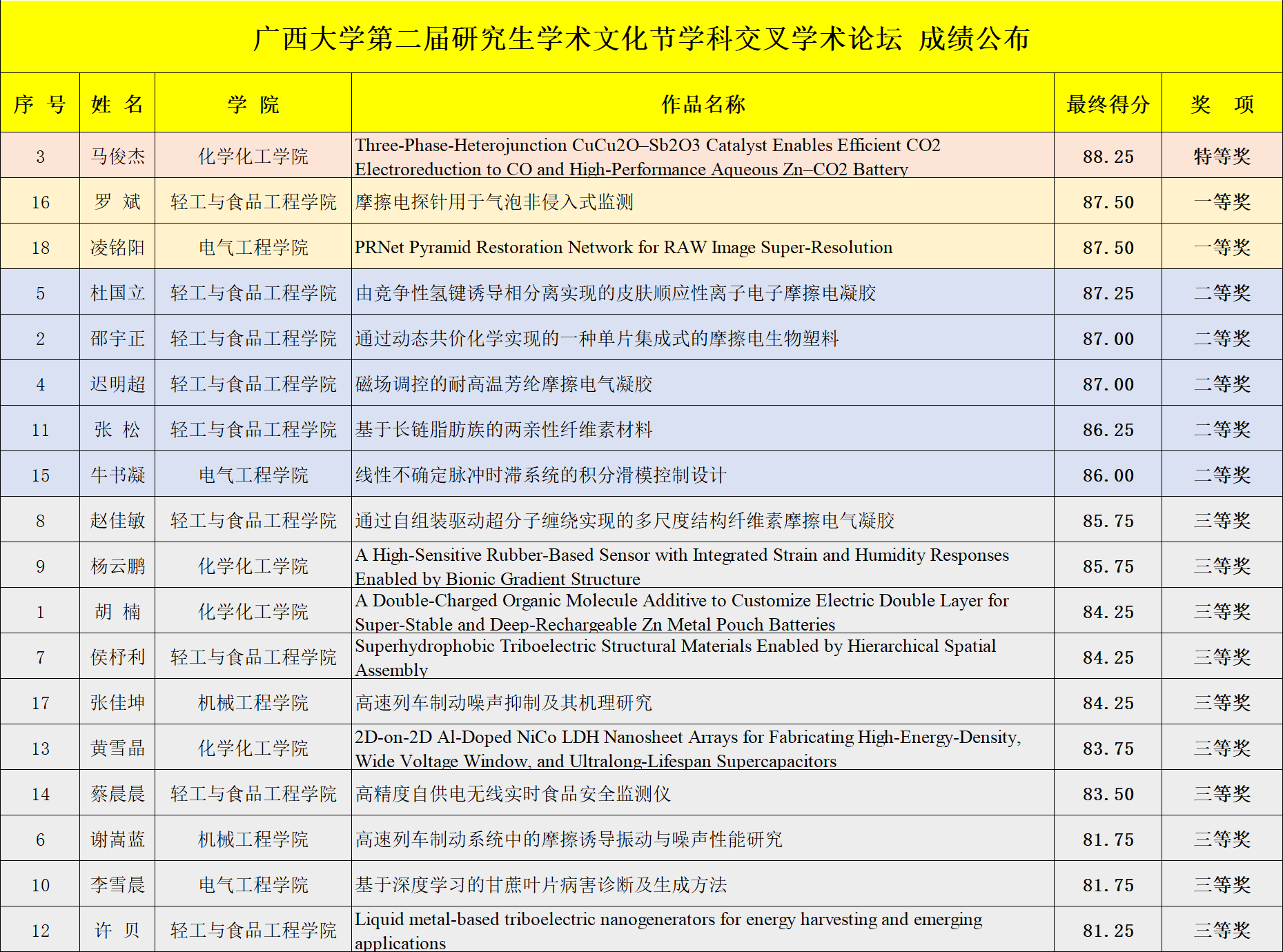 第二届研究生学术文化节 “学科交叉”学术论坛结果如下: