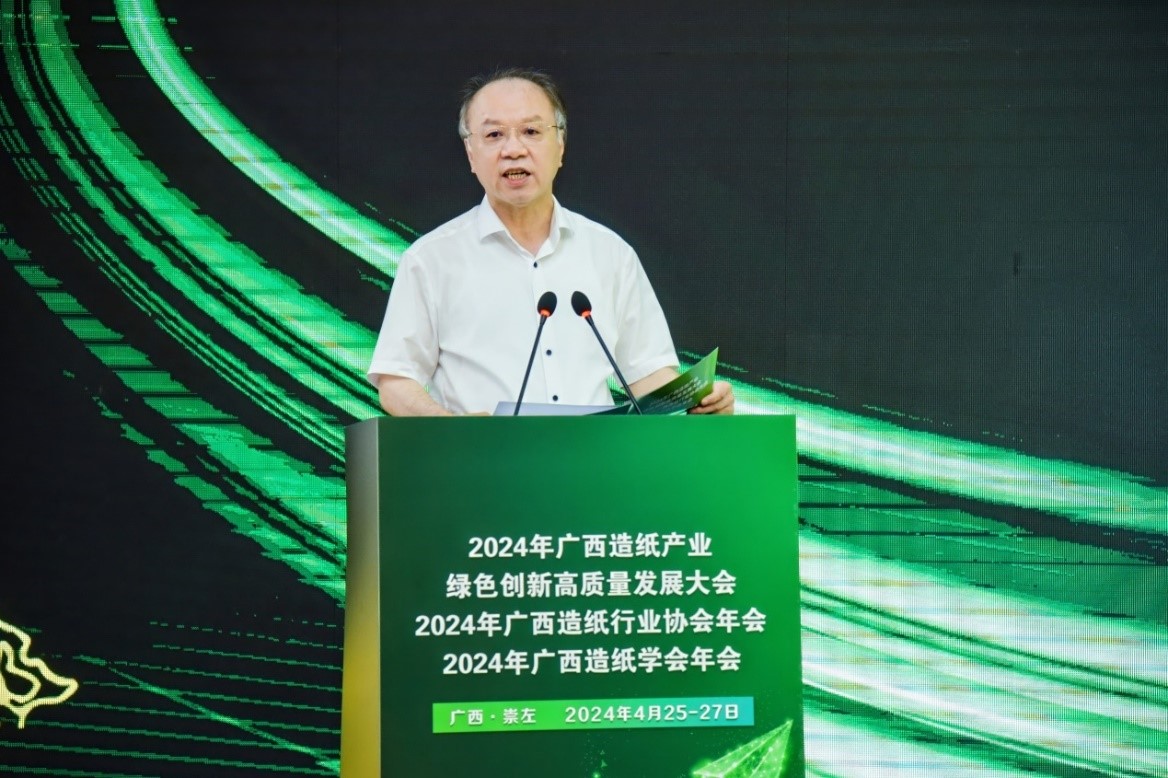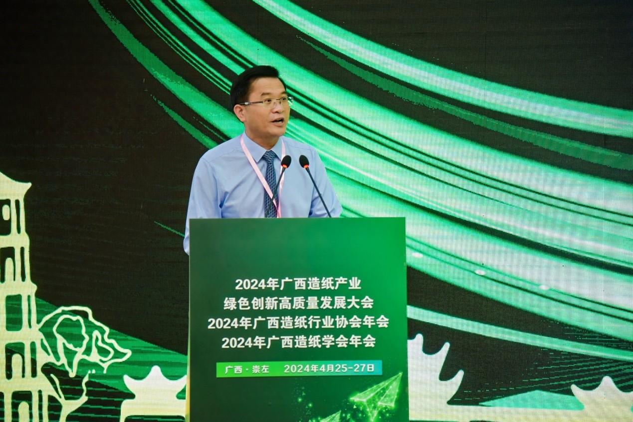 院长覃程荣教授主持。中国工程院院士王双飞在致辞中回顾了2023年广西造纸行业取得的进展,强调了未来几年应该重点做好的几方面工作,主要包括:发挥资源优势、发展新质生产力和加强人才培养。崇左市副市长黄覃梅代表崇左市人民政府对出席本次会议的领导、嘉宾和朋友们表示热烈的欢迎,并在致辞中介绍了崇左市依托植物资源优势开展的重要举措和成效。崇左理文纸浆制品有限公司副总经理周永丽在致辞中感谢了造纸行业同行对崇左理文的大力支持,介绍了崇左理文全产业链循环模式的理念。广西造纸行业协会会长、广西东糖投资有限公司副董事长林伟民在致辞中围绕广西造纸行业的高质量发展,强调了坚持绿色发展理念、强化创新驱动、深化开放合作和加强人才队伍建设四项建议。