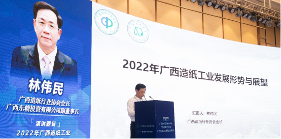 广西造纸行业协会会长、广东东糖投资有限公司副董事长林伟民做了题为“2022年广西造纸工业发展形势与展望”的报告。2022年,广西造纸行业乘风破浪、踔厉奋发、赓续前行,交出了一份喜人答卷,浆纸总规模接近千万吨,头部企业项目陆续投产,新项目火热建设。经统计测算,如各大项目能在“十四五”时期顺利投产,浆纸合计产能将达到4200万吨。