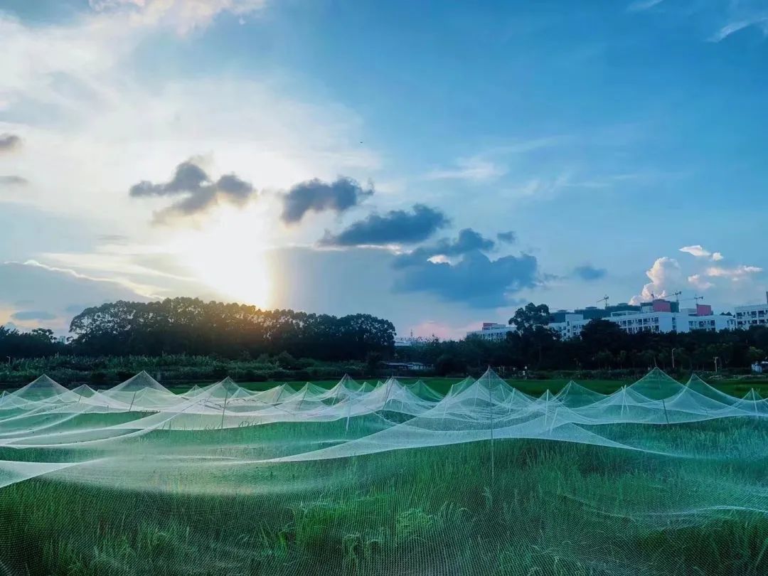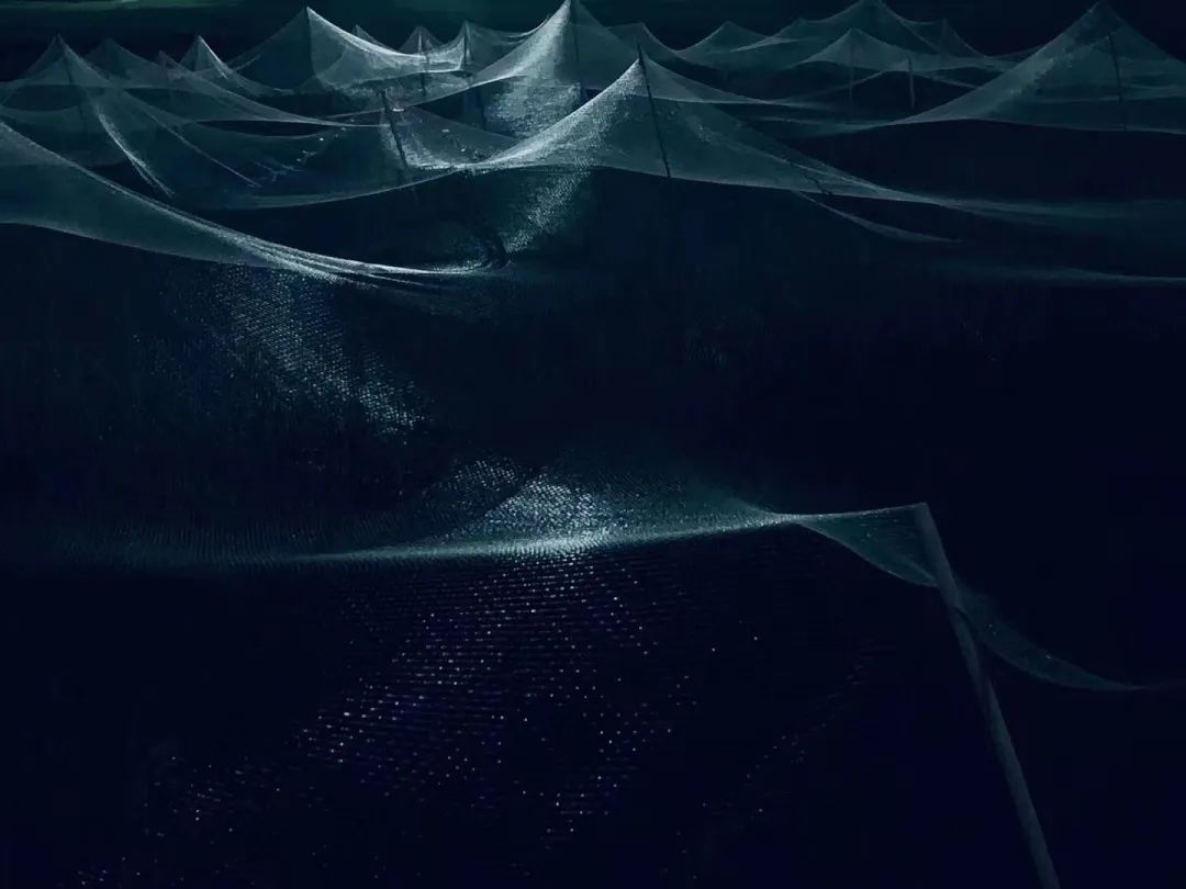 灯光映照在农场稻田的防鸟网格布上,初夏的风吹得稻田波浪般起伏,光影随之跳跃,就像流霜中的花林。