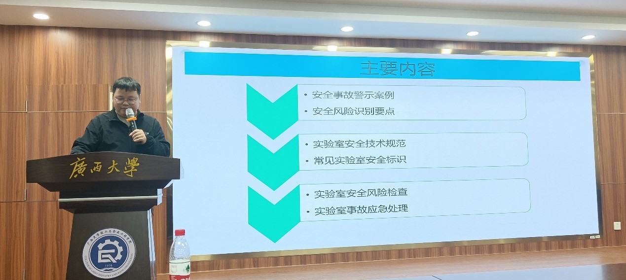 2024年10月29日上午,学院实验中心邀请了广西壮族自治区产品质量检验研究院高级工程师陈德翼,开展了题为《实验室安全风险识别及应急处理》的安全教育培训。培训会由学院分管科研及实验室副院长陆登俊主持,实验中心全体老师、学院全部实验室安全管理助理及部分师生参加了培训。