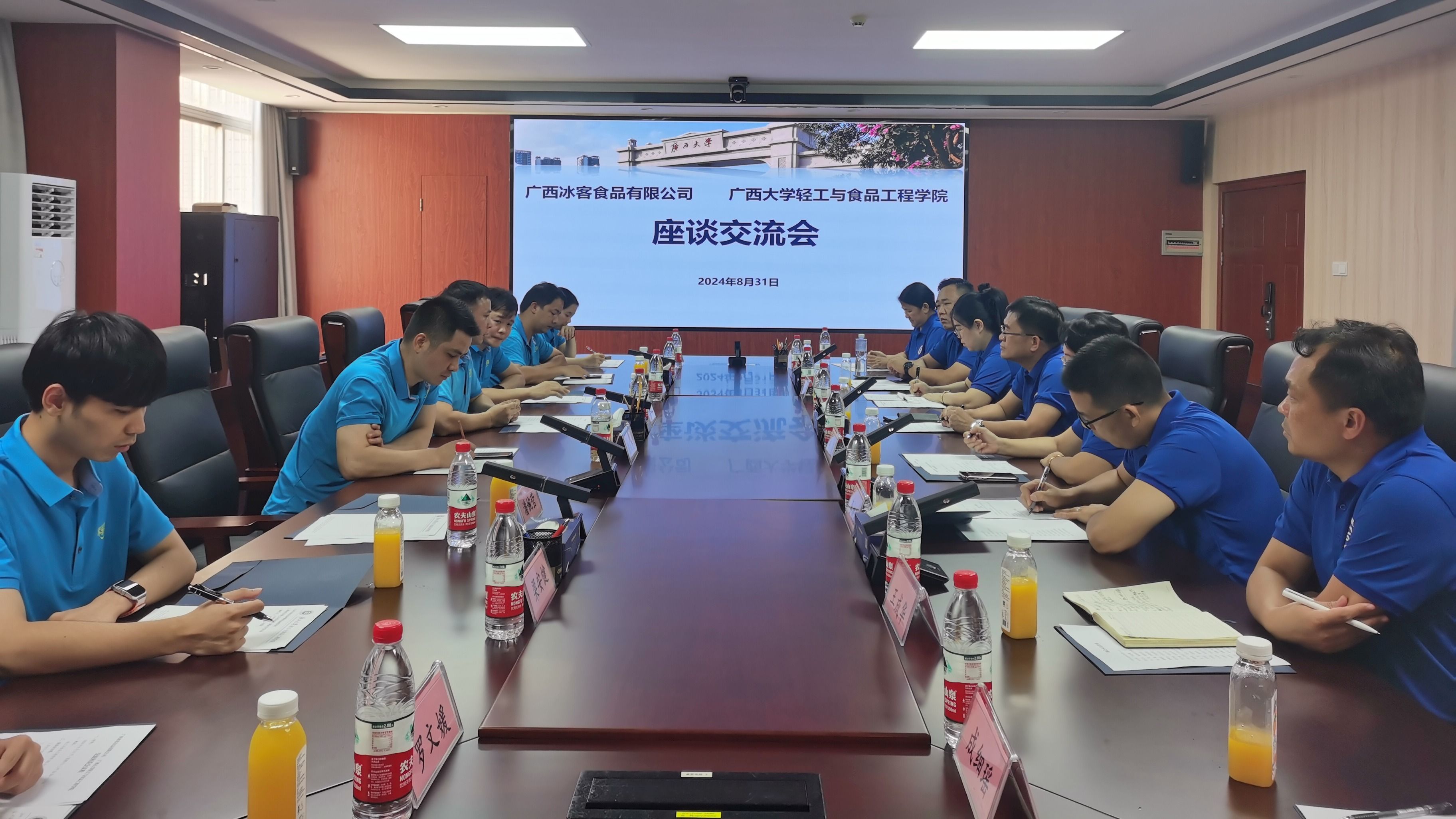 8月31日,广西冰客食品有限公司总经理韦志福、制造部总经理/研发总监庞成友、销售总监罗锐一行到访交流。院长、党委副书记覃程荣主持座谈会,副院长林莹、陆登俊,食品科学与工程系主任李树波等7人参会。