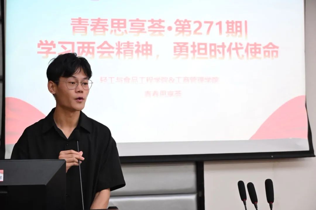 宣讲结束后,两院学生干部代表结合自身的学习和实践经历,分享对两会精神的理解以及践行体会。他们从不同视角展现了青年学生如何将两会精神融入日常,为同学们带来了启发和思考。