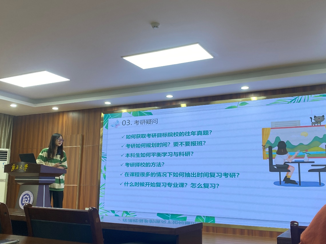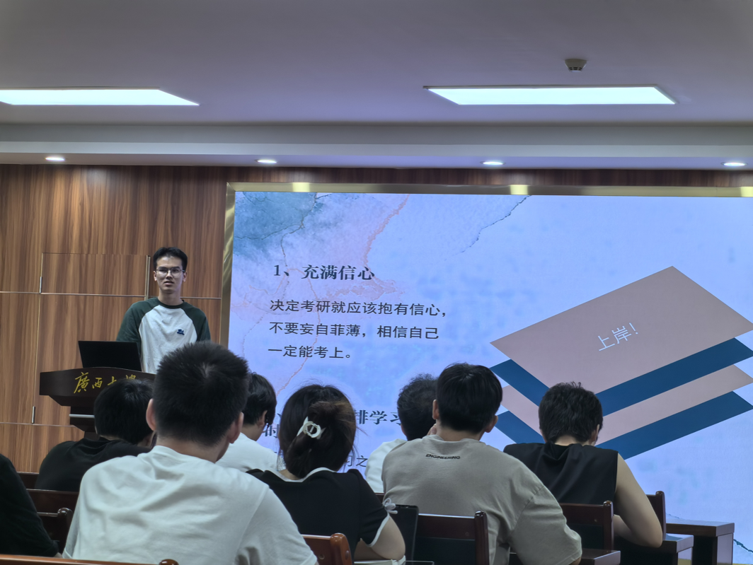 优秀共青团员”等荣誉称号。他向大家介绍了考研前期一系列的复习方法,以及复试面试的小技巧,最后向大家强调了调整心态的重要性。