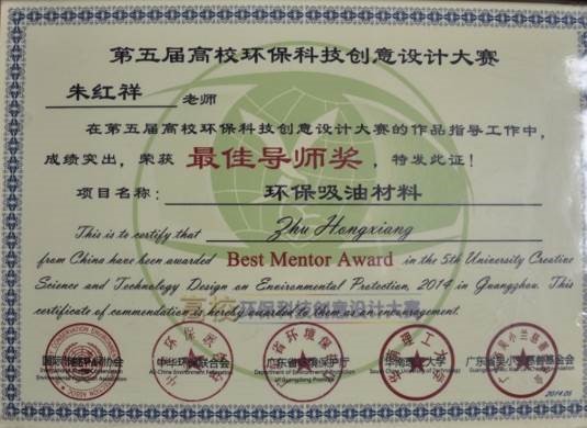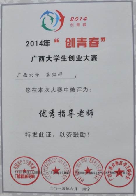 生创业大赛金奖,朱红详老师在本次大赛中获得“优秀指导老师”; |