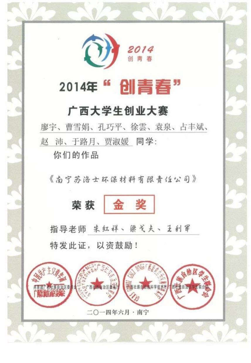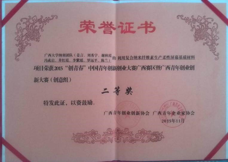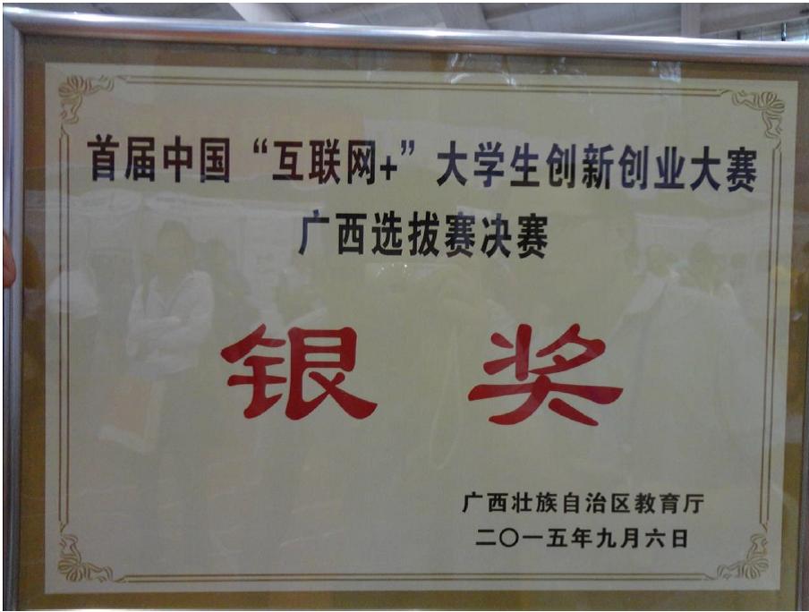 1. 全国2015年度“小平科技创新团队” 2. 2015年度“创青春”中国青年创新创业大赛总决赛优秀奖 3. 2015年度“创青春”中国青年创新创业大赛广西赛区暨广西青年创业创新大赛二等奖 4. 第二届“创青春”中国青年创新创业大赛南宁市选拔赛二等奖 |